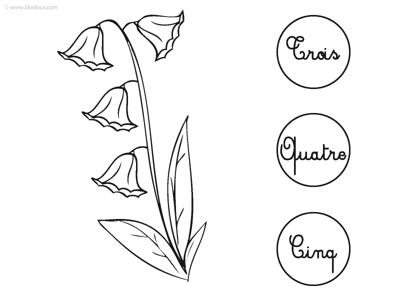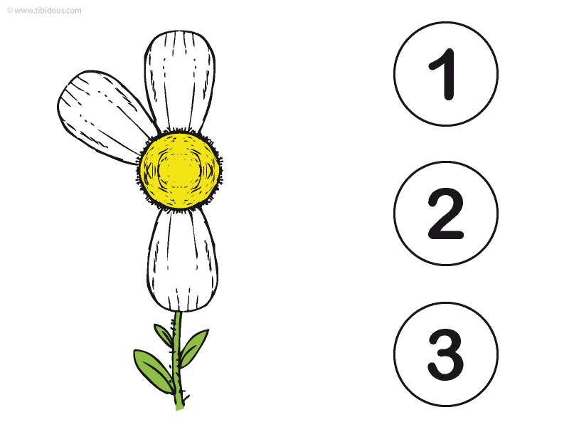Commencez par définir ce que l'enfant va compter. Par exemple, dites-lui : Nous allons compter ensemble le nombre de pétales sur cette fleur. Combien vois-tu de pétales ? Puis aidez le, pointez les pétales en comptant distinctement. Si l'enfant n'a pas participé oralement, faites-lui répéter la séquence d'énumération en l'accompagnant. Enfin, proposez-lui de colorier la bonne étiquette.